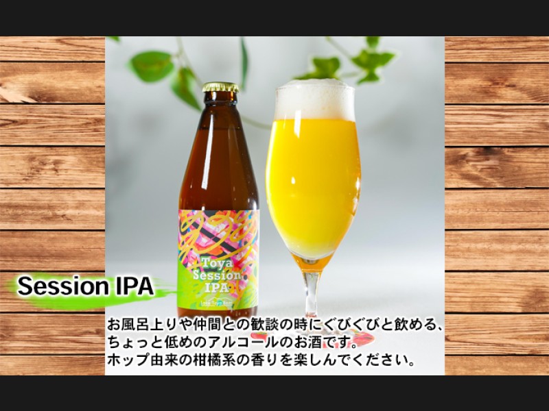 Lake Toya Beerの定番3種類(Toya SessionIPA(発泡酒)、Toya IPA(発泡酒)、Toya Weizen(発泡酒)を各2本ずつの6本をセットにしました。紙コースター2枚をお付けして3カ月連続でお届け致します。