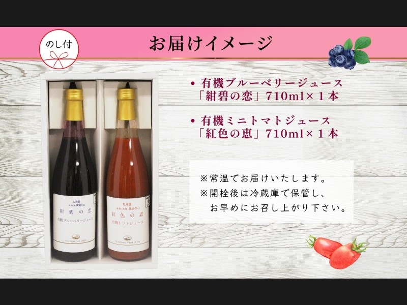 北海道の農園で、人の手で丁寧に有機栽培された「ブルーベリー」と「ミニトマト」のジュースをセットにしました。