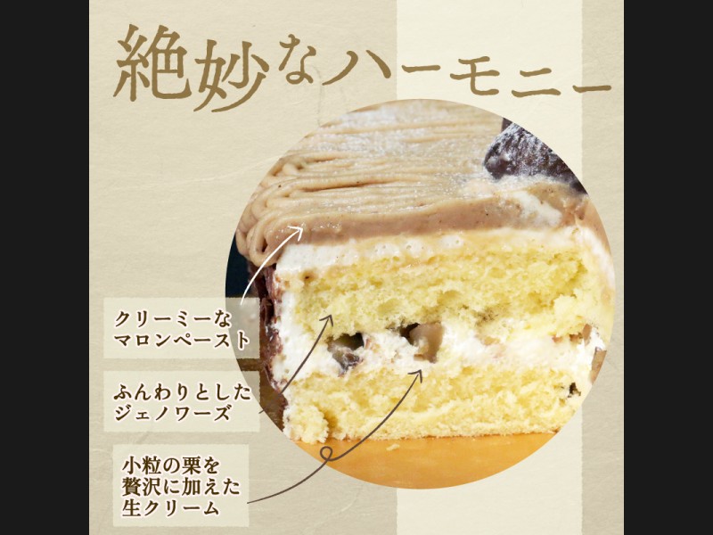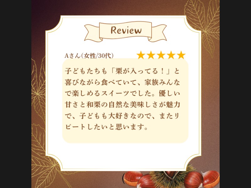厳選された国産栗を贅沢に使用し、栗本来の自然な甘さとほのかな苦味が絶妙なバランスを作り出しています。一口ごとに広がる、栗の深い風味は他にはない上品な味わいは小さなお子様からご年輩の方まで幅広い年齢層の方々に愛されています。