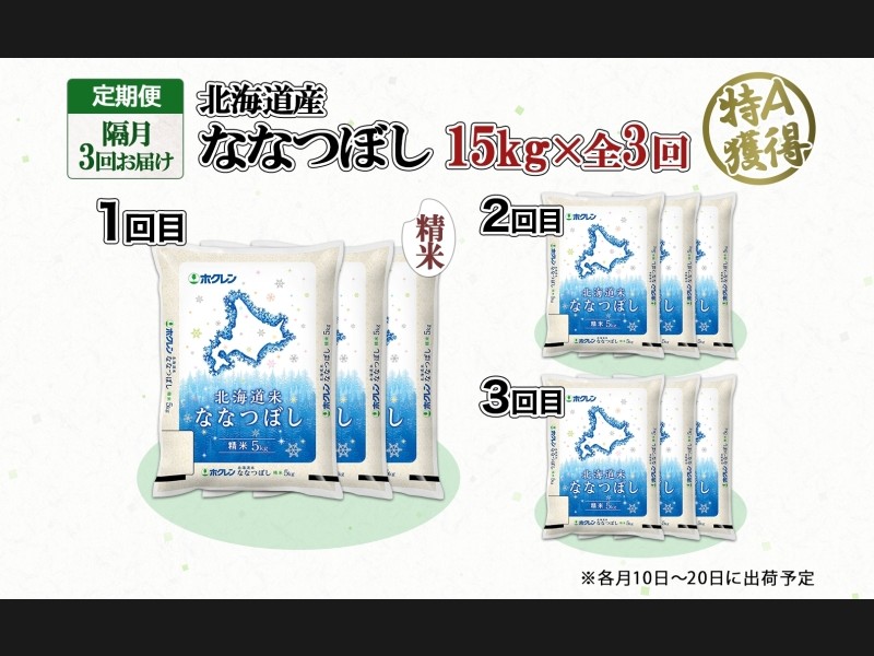 定期便 隔月3回 北海道産 ななつぼし 精米 15kg 米 特A 白米 お取り寄せ ごはん 15キロ 5kg ×3袋 道産米...
