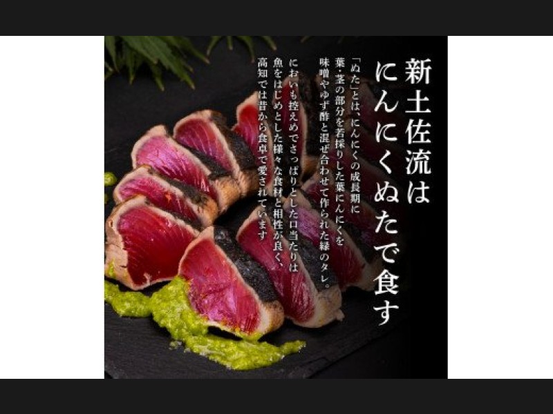 サイズ: ・かつおのたたき1節(1節:約300g~400g)、有機無添加土佐にんにくぬた20ml×1袋、たたきのタレ15ml×1袋、おろしニンニク2g×1袋