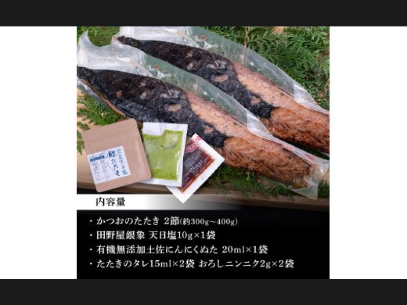 ・かつおのたたき1節(1節:約300g~400g)、田野屋銀象 天日塩10g×1袋、たたきのタレ15ml×1袋、おろしニンニク2g×1袋
