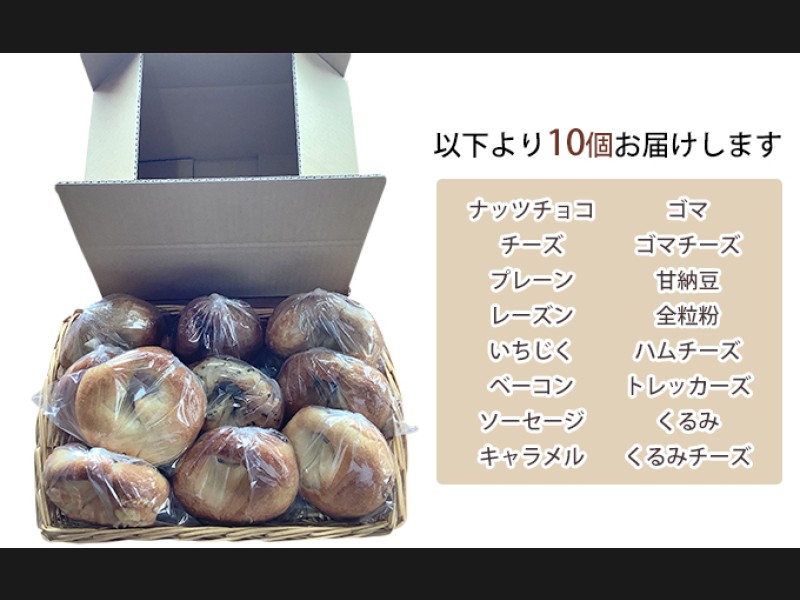 プレーンベーグルのほか、チーズ、ドライフルーツ、ナッツが入ったものなど、当店おすすめのベーグル10個を詰め合わせにしました。北海道産の小麦と天然酵母で焼き上げるもっちりと食べ応えのあるベーグルです。