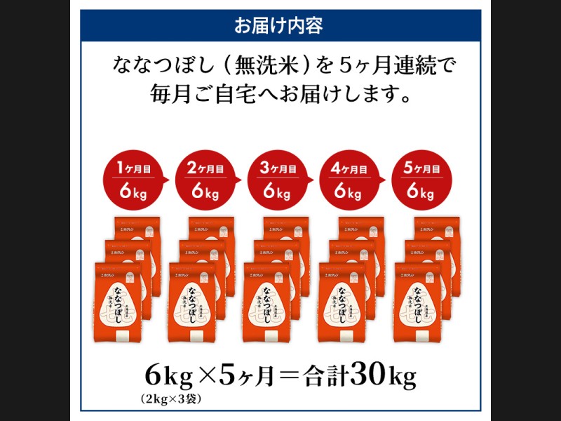 5ヵ月 定期便 (無洗米6kg)ホクレン喜ななつぼし(無洗米2kg×3袋) 北海道米 お米 白米 ごはん ご飯 ライス...