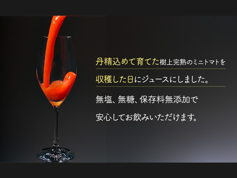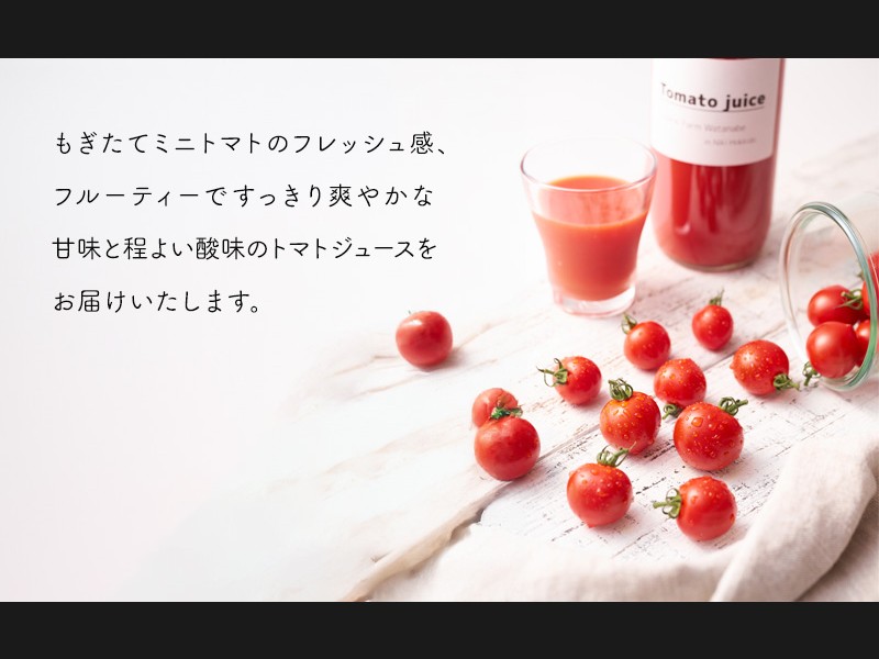 もぎたてミニトマトのフレッシュ感、フルーティーですっきり爽やかな甘味と程よい酸味のトマトジュースをお届けいたします。