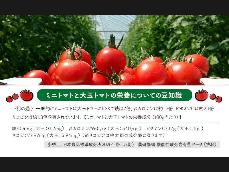 下記の通り、一般的にミニトマトは大玉トマトに比べて鉄は2倍、βカロテンは約1.7倍、ビタミンCは約2.1倍、リコピンは約1.3倍含有されています。