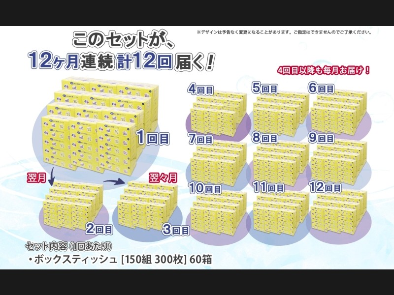 北海道 定期便 12ヵ月連続 とけまるくん 水に流せる ティッシュ 150組 計60箱 ティッシュペーパー ボッ...