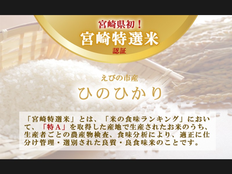 えびの産ひのひかりは、米の食味ランキング(※)で宮崎県では初となる国内最上位ランクの「特A」を獲得し、米としては初めて宮崎県のブランドとなる「宮崎特選米」として産地認定されました。