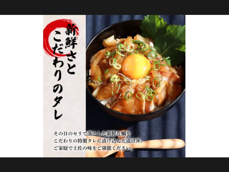 魚屋がその日のセリで落とした新鮮な鯛で漬け丼を作りました。鯛が一番美味しくなるタレで漬け込みました。田野町で揚がった新鮮で活きのいい田野町を代表する魚です。規格外の魚や出荷できなかった魚たちを一つも捨てることなく、“すべて大切な海の子供たちである”ということを念頭に商品づくりをしています。田野町の海の素晴らしい産物を皆様でぜひご賞味くださいませ。