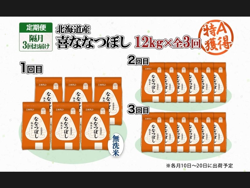 定期便 隔月3回 北海道産 喜ななつぼし 無洗米 2kg×6袋 計12kg 米 特A 白米 小分け お取り寄せ ななつぼ...