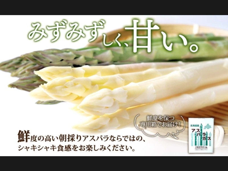 ニセコファームのアスパラは食感がシャキシャキでえぐみが少なく、甘くてみずみずしいのが特長です。