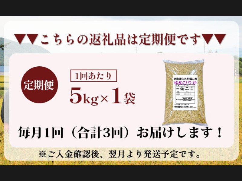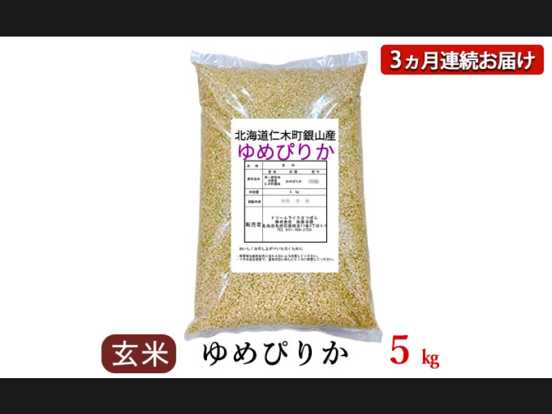 3ヵ月 定期便 銀山米研究会の玄米<ゆめぴりか>5kg×1袋【機内食に採用】 ライス ブランド米 おにぎり ...