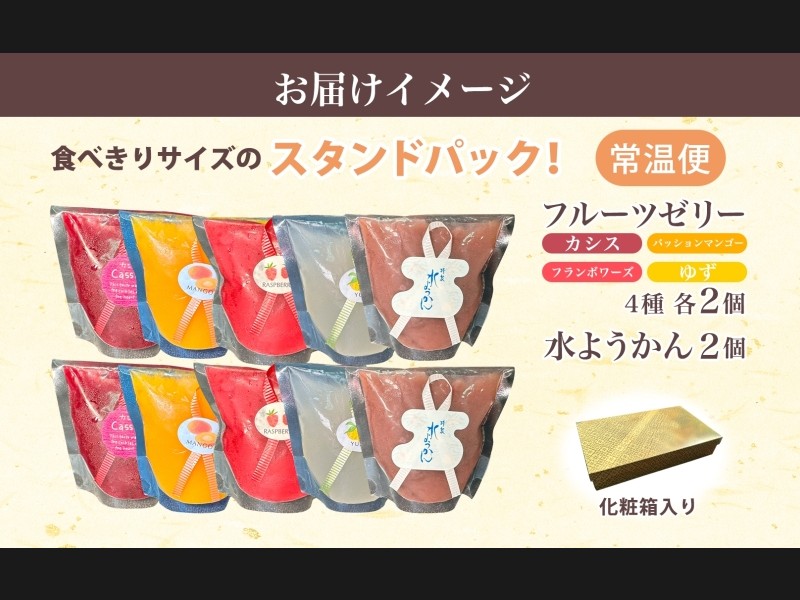 サイズ: 5種各2個(フルーツゼリー4種+水ようかん)化粧箱入り