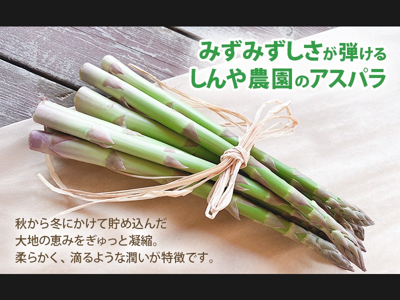 豊富な湧き水で育ったアスパラガスは、みずみずしくて柔らかく秋から冬の間に蓄えていた養分を蓄えて育ちます。春の旬のグリーンアスパラガスで、塩茹でや蒸し野菜はもちろん、パスタやスープなどいろいろな料理に存分にお楽しみいただけます。