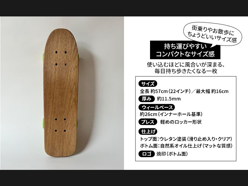 素材には北海道産の木材を中心に使用し、クラフトの温もりと滑走性能を両立しています。
