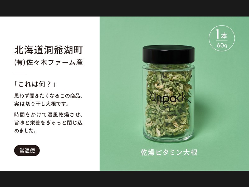 Unpackは、栽培期間中化学的な肥料 ・農薬を使用せずに生産された野菜を、乾燥野菜に加工・販売することで、