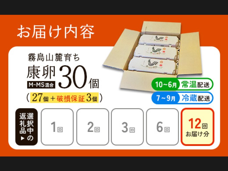 卵【12回定期便】霧島山麓育ち こだわり卵 康卵 計 30個(27個 + 割れ保証 3個)12回 計 360個(324個 +...