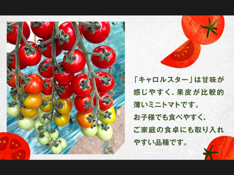 昼夜の気温差が大きい仁木町では糖度が高まり、甘く美味しいミニトマトが育ちます。「キャロルスター」はその中でも甘みを感じやすい品種で、お子様からご家族みんなで楽しめるミニトマトです。みずみずしい食感で、サラダやお弁当の彩りにもおすすめです。ぜひお楽しみください。
