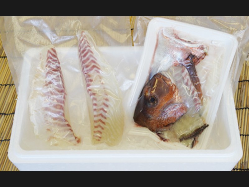 三枚おろしにして皮引きした、さしみ用切り身と鯛のアラ(頭、カマ、背骨、腹骨)を冷凍せずに生のまま真空パックにしてお届け!