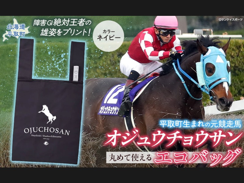 障害レース界の絶対王者「オジュウチョウサン」の放牧地で立つ雄大な姿がデザインされた丸めて使える「クルリト MOTTERU」のエコバッグです。