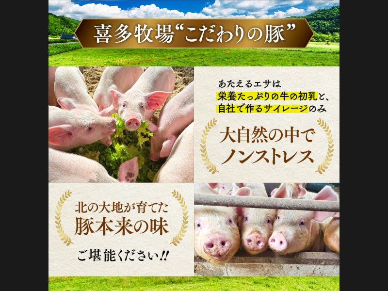 流氷の街紋別のオホーツクファーム喜多牧場で、牛乳(初乳)をお腹いっぱい飲ませて大切に育てられた放牧ぶた。