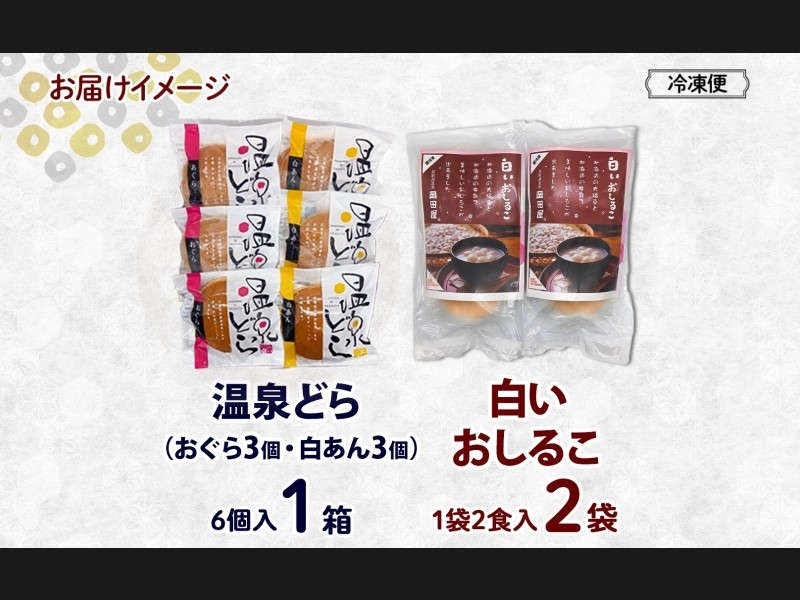 ※賞味期限「おしるこ:製造より冷凍6ヵ月 温泉どら:解凍後冷蔵5日以内」