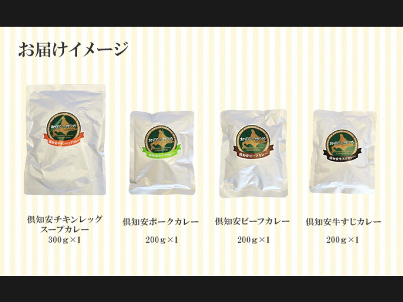 北海道 倶知安町の味覚がぎゅっと詰まった、こだわりのカレー4種(チキンレッグスープカレー・ビーフ・ポーク・牛すじ)のセットです。