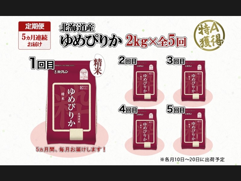 北海道の特A米『ゆめぴりか』精米 2kg×全5回をお届けします。