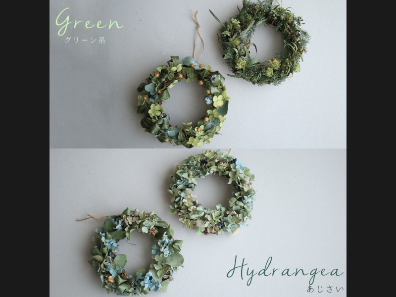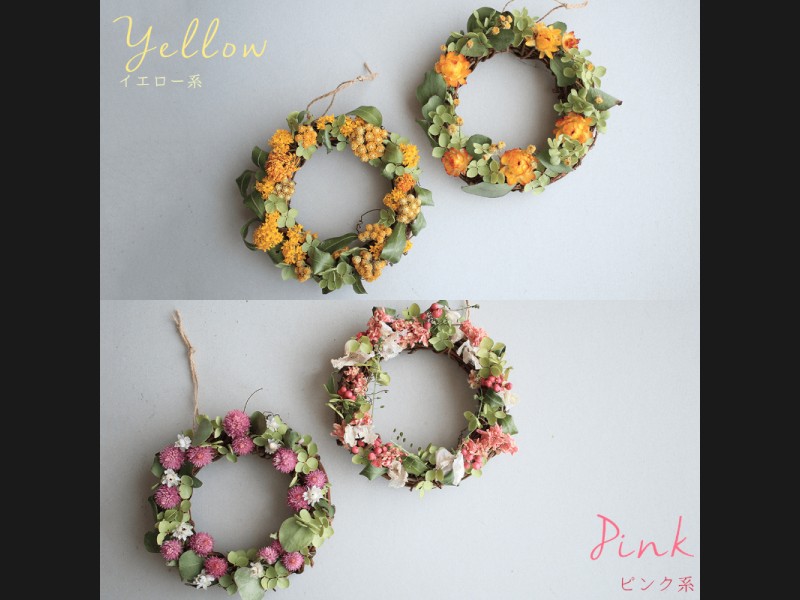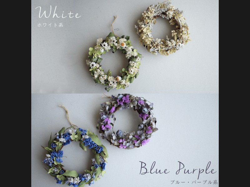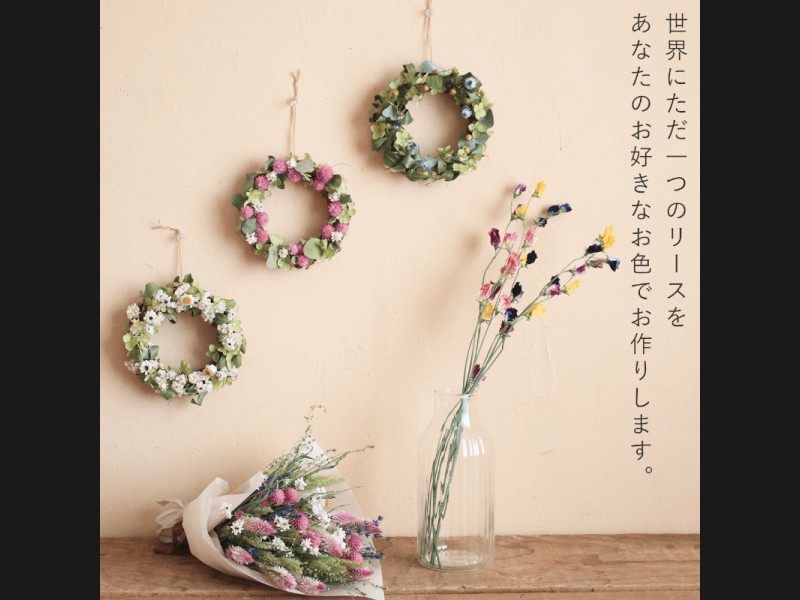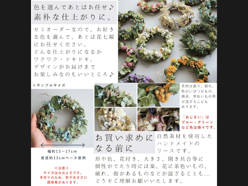 お好きなカラーを選ぶだけで花七曜らしい素朴なデザインのミニリースが届くドライフラワーセミオーダーリースが登場です。
