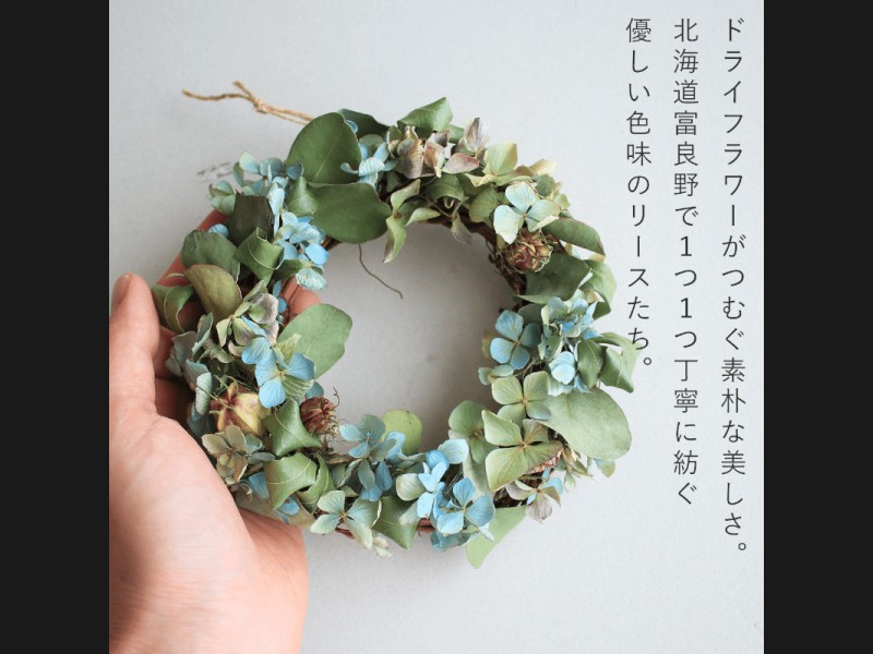花七曜のこだわりのドライフラワーをつかって北海道富良野で1つずつ丁寧におつくりするリース。