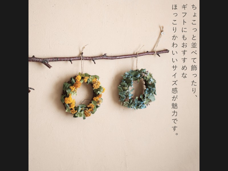 仕上がりサイズがおよそ直径14cmと小さめサイズのリースはスワッグやつり下げかご、リースなどとあわせて飾ったり、お手洗いやサニタリーなどのちょっとした空間に飾るのがおすすめ。