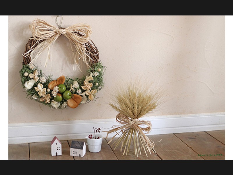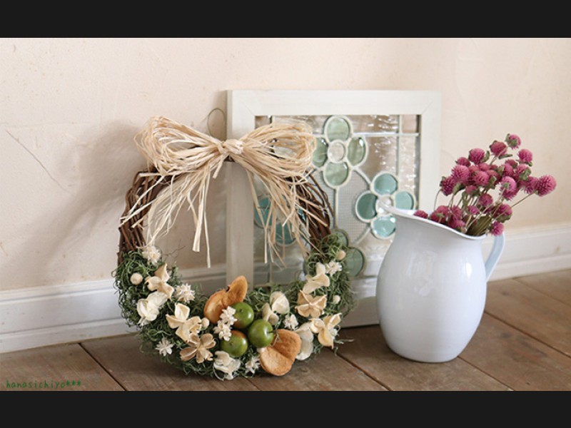 大自然に囲まれたかわいらしいお家のドアに飾ってあるリースをイメージしてシンプルにナチュラルにデザインしました。