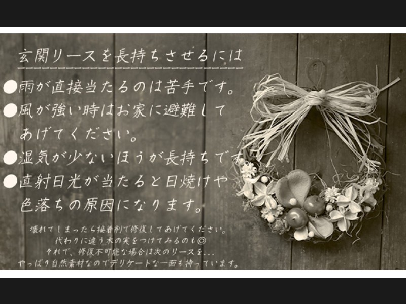 ※玄関外用リースとして頑丈にはおつくりしていますが、風雨や直射日光に当たると劣化が早くなります。
