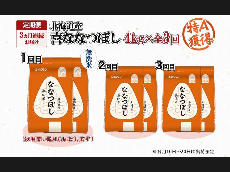 定期便 3ヵ月連続3回 北海道産 喜ななつぼし 無洗米 4kg 米 特A 白米 ななつぼし ごはん ブランド米 4キ...