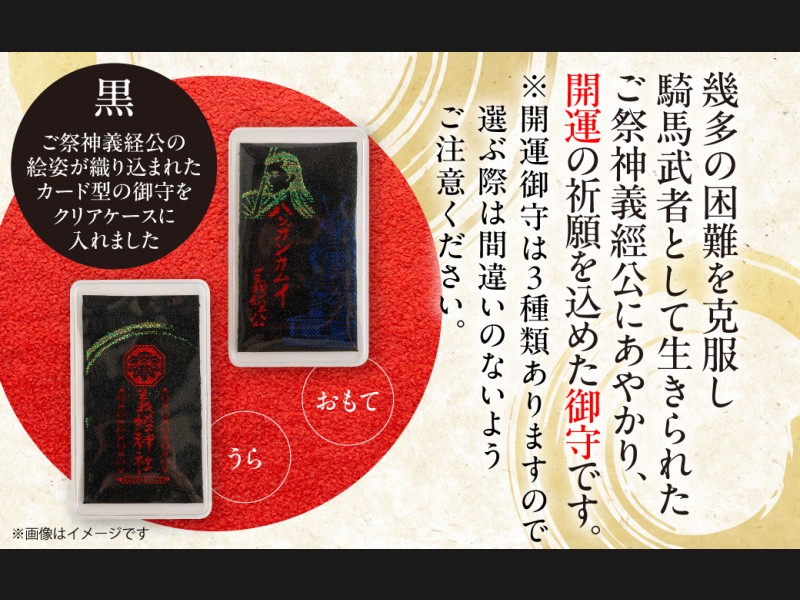 幾多の困難を克服し騎馬武者として生きられたご祭神義經公にあやかり、開運の祈願を込めた御守です。