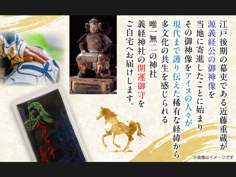 江戸後期の幕吏である近藤重蔵が、源義経公の御神像を当地に寄進したことに始まり、その御神像をアイヌの人々が現代まで護り伝えた稀有な経緯から、多文化の共生を感じられる唯一無二の神社、義経神社の開運御守をご自宅へお届けします。