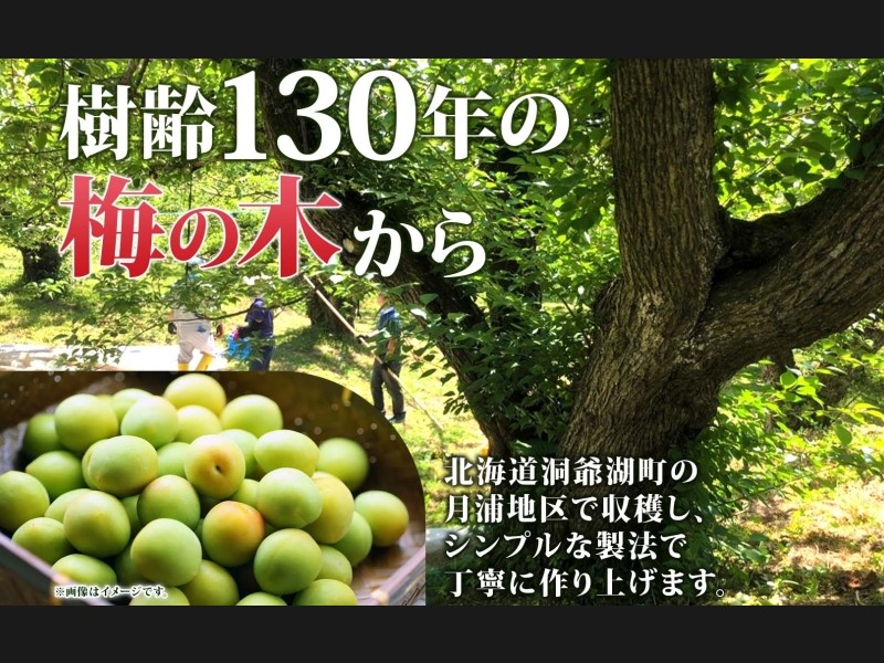 北海道・洞爺湖町の月浦地区にて、先祖代々、大平さんご一家が大切に守りつがれてきた「樹齢130年」の梅の木から収穫される梅で漬けた昔ながらの梅漬けです。7月にご家族総出で、大切に青梅を一粒一粒収穫して、原料はシンプルなものにこだわり、昔ながら手法でつくられています。