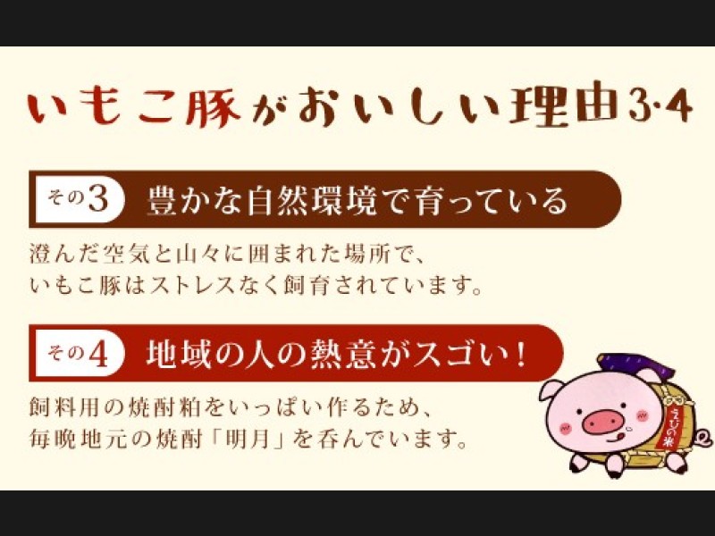「いもこ豚」とは、宮崎県えびの市産の「お米」と「焼酎粕」をブレンドした飼料を与え、えびのの山頂で健やかに育った豚です。