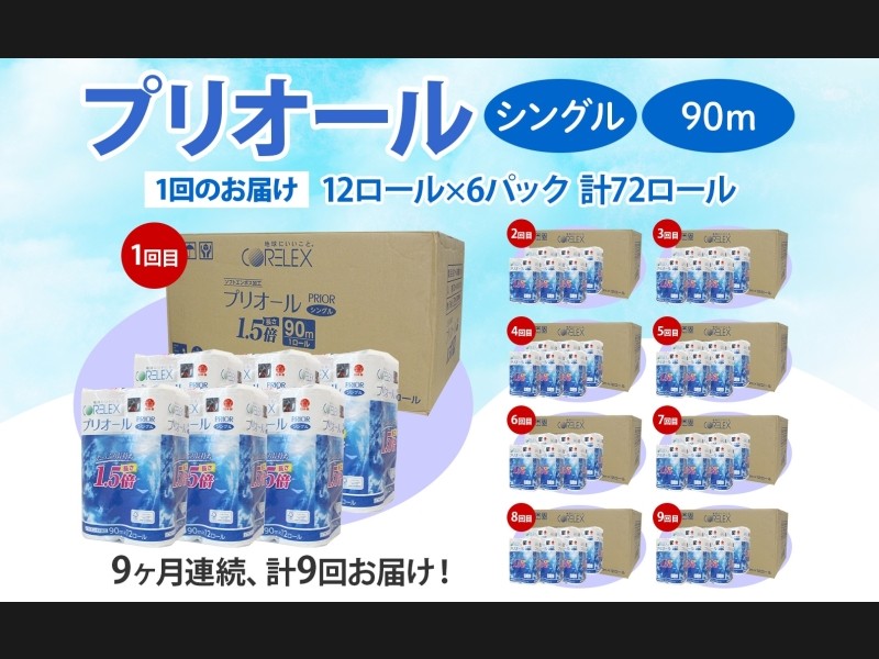定期便 9ヵ月 連続 全9回 プリオール・ピコ トイレット ペーパー 1.5倍巻き シングル 90m 12ロール 6パ...