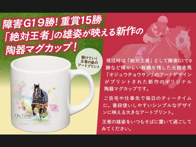 障害レース界の絶対王者「オジュウチョウサン」のアートデザインがプリントされた新作のオリジナル陶器マグカップです。