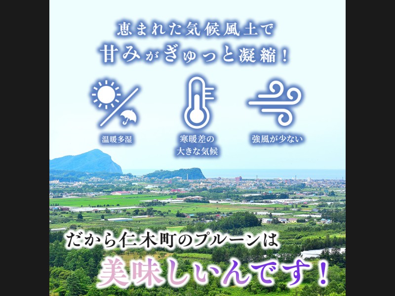 昼夜の気温差がありおいしいフルーツがとれる仁木町から、当園で栽培している数種類のプルーンのうち9月収穫の旬のプルーンをお届けいたします。