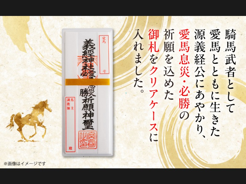 騎馬武者として愛馬とともに生きた源義経公にあやかり、愛馬息災・必勝の祈願を込めた御札をクリアケースに入れました。