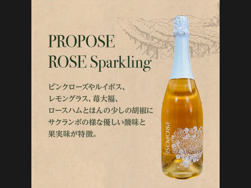 PROPOSE ROSE Sparkling NV:ピンクローズやルイボス、レモングラス、苺大福、ロースハムとほんの少しの胡椒にサクランボの様な優しい酸味と果実味が特徴のワイン。