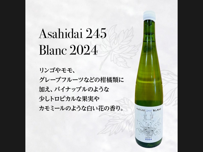Asahidai 245 Blanc 2024:リンゴやモモ、グレープフルーツなどの柑橘類に加え、パイナップルのような少しトロピカルな果実やカモミールのような白い花の香り。
