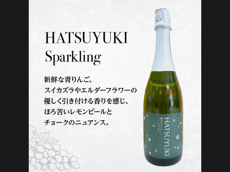 HATSUYUKI Sparkling NV:豊かに立ち込めるシルキーな泡の質感。新鮮な青りんご、スイカズラやエルダーフラワーの優しく引き付ける香りを感じ、ほろ苦いレモンピールとチョークのニュアンスがメリハリをつけるワイン。