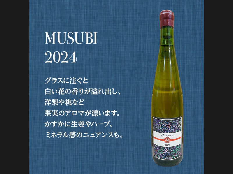 MUSUBI 2024:Domaine Blessメインブランドの白ワインである「MUSUBI」。昨年までは8品種の混醸でしたが、オーセロワが追加になり2024 ヴィンテージは9品種の混醸ワインとなりました。