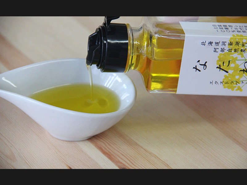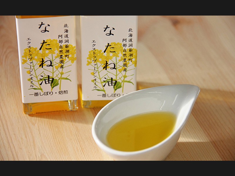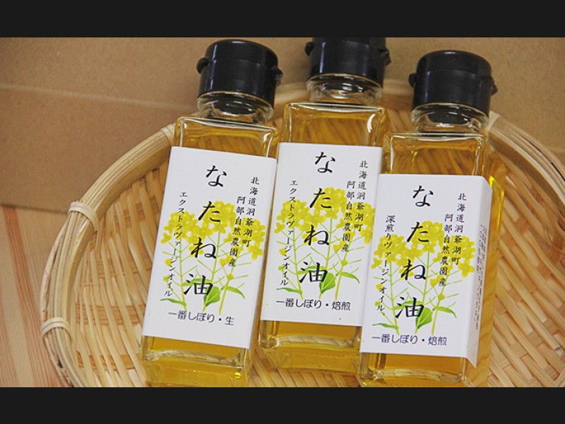 噴火湾を一望できる、洞爺湖町の大自然に囲まれた畑で、丹精こめて育てられた、なたねから、丁寧に「圧搾法」(なたねに圧力をかけて搾ったもの)を自然濾過してつくられる、大変な手間暇がかかったなたね油です。
