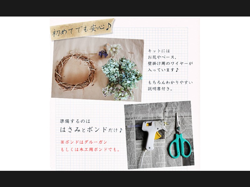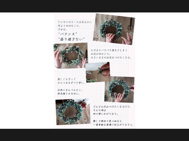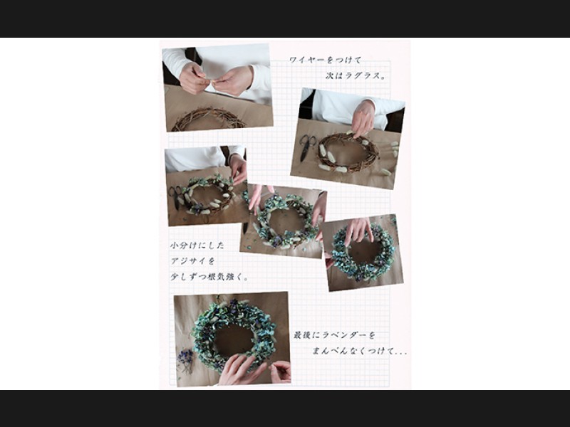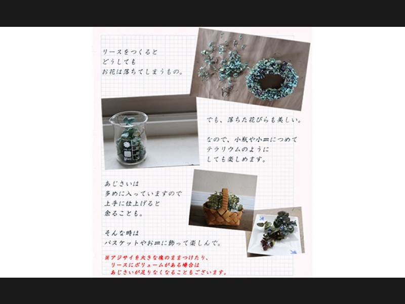 ※画像のような細身のあじさいのリースができる分量のあじさいが入っています。花のつけ方によってはアジサイが足りなくなることがございます。説明書をよくお読みになってお作り下さい。