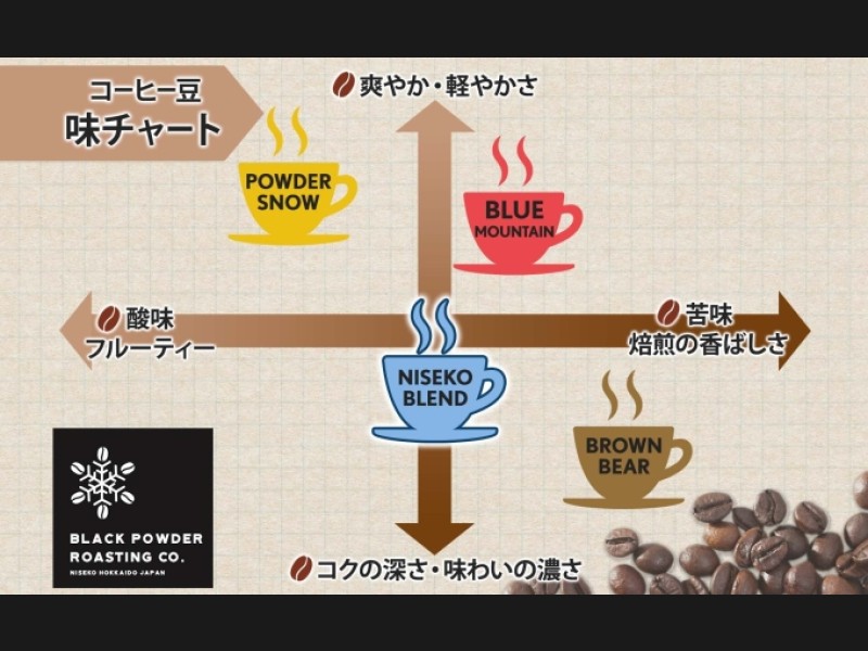 珈琲の名前にも、ニセコと焙煎の深さを連想できるユニークなネーミングをつけています♪