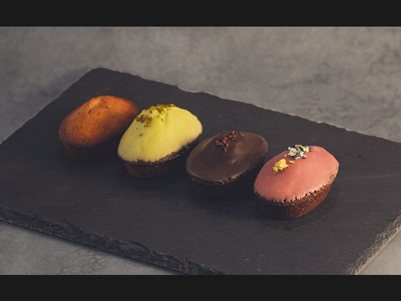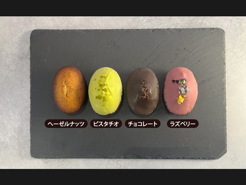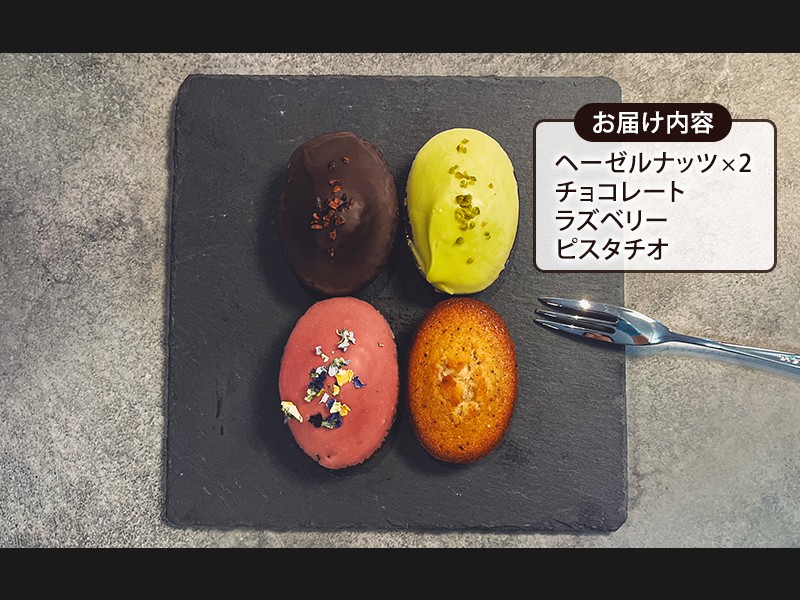 サイズ: フィナンシェ「ヘーゼルナッツ、チョコレート、ラズベリー、ピスタチオ」